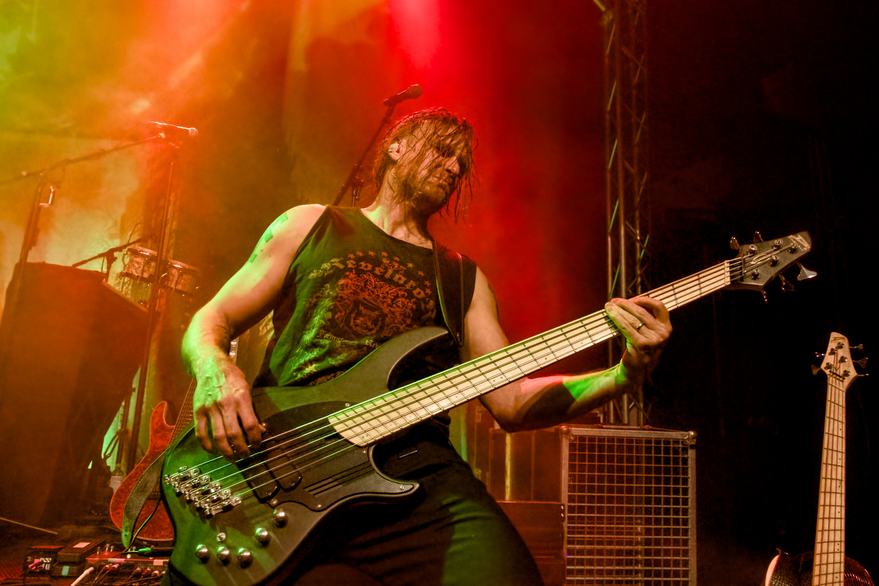 Aber glücklicherweise streuen die Jungs live immer mal wieder ein paar pfiffige Einfälle ins arg frickelige Riff-Gewitter ein. So verbreitet etwa „Skyline“ nach einem einleitenden atmosphärischen Gitarrensolo sogar ein paar Elektro-Vibes in der Halle, bevor es dann wieder mit voller Härte und kompliziert weitergeht. Ganz klar: Hier lassen Tesseract und Co. schön grüßen. An anderer Stelle tauscht Lead-Gitarrist Jussi Poikonen seine Klampfe gar mit einem Saxofon, was dem Stück „Unknown“, auch durch einen anschließenden langen Instrumental-Part, eine leicht jazzigere Note verleiht. Druckvoll rüber und sofort auf den Punkt kommen dagegen die neuen Songs „Free Fall“ und die kürzlich erst veröffentlichte Single „Eternal Erode“, hier sogar inklusive einem Growl-Part von Sänger Sakari Ojanen. Die volle Halle honoriert’s mit viel Applaus, mittlerweile wird bereits ordentlich „geheadbangt“, wozu die brettharten Oddland-Sounds ja geradezu einladen.