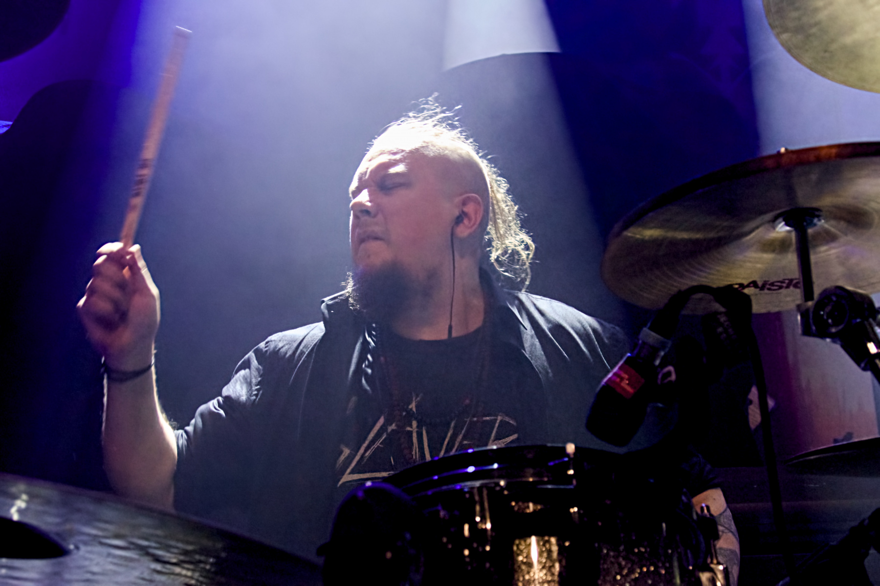 Zwischendurch verschlug’s mich sogar mal vor das Drumkit von Schlagzeuger Ville Viitanen. So eng wie es in der Zeche Carl ist, saß er mir dabei quasi gegenüber. Seine Bassdrum schüttelte mich so heftig durch, dass ich heilfroh war, an meine MusicSafe-Ohrstöpsel gedacht zu haben. Schon bei Oddland war es richtig laut, daher warnte mich meine Smartwatch mehrfach vor einem Geräuschpegel von mehr als 100 Dezibel. Umso erstaunter war ich, um mich herum nur fast nur Leute ohne Gehörschutz zu sehen. Unfassbar! Entweder waren die alle schon taub oder würden es spätestens nach dem Headiner sein.