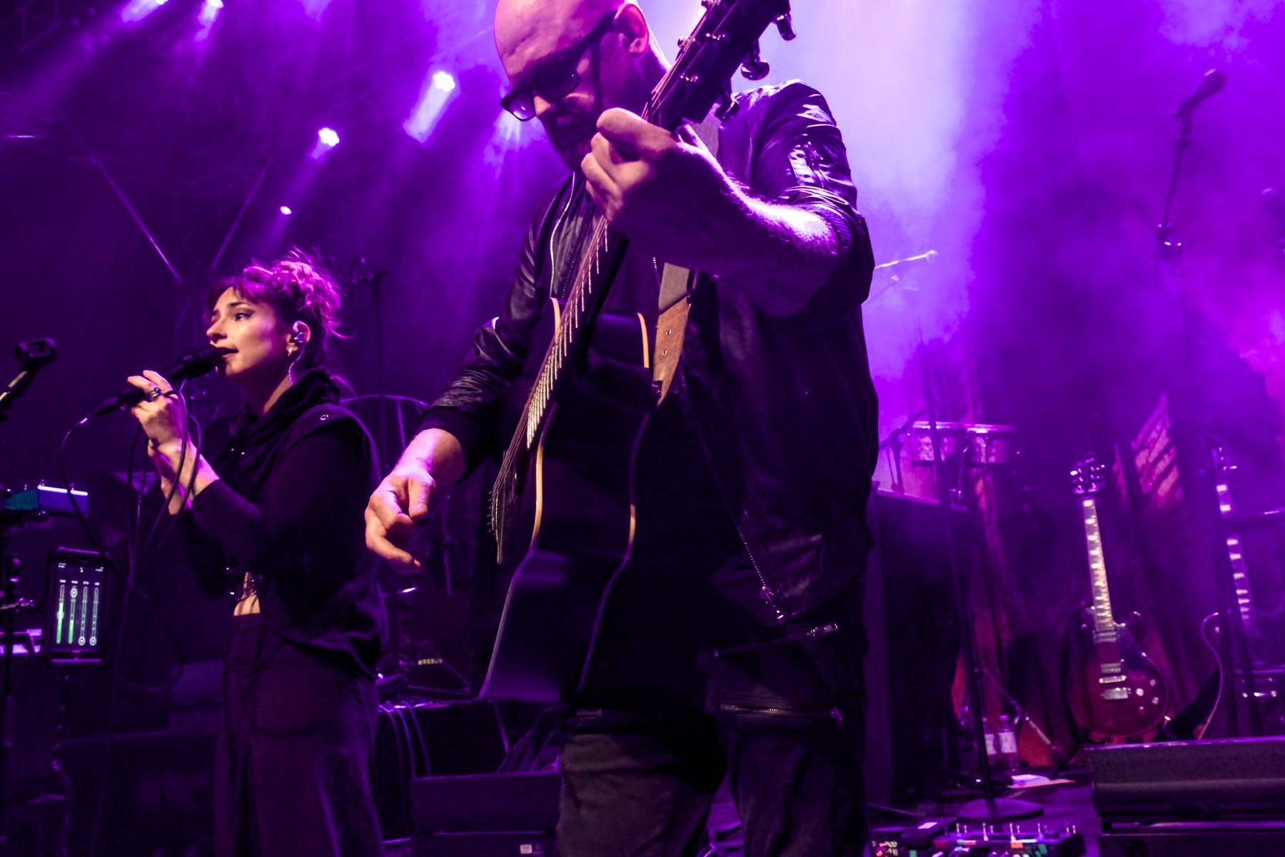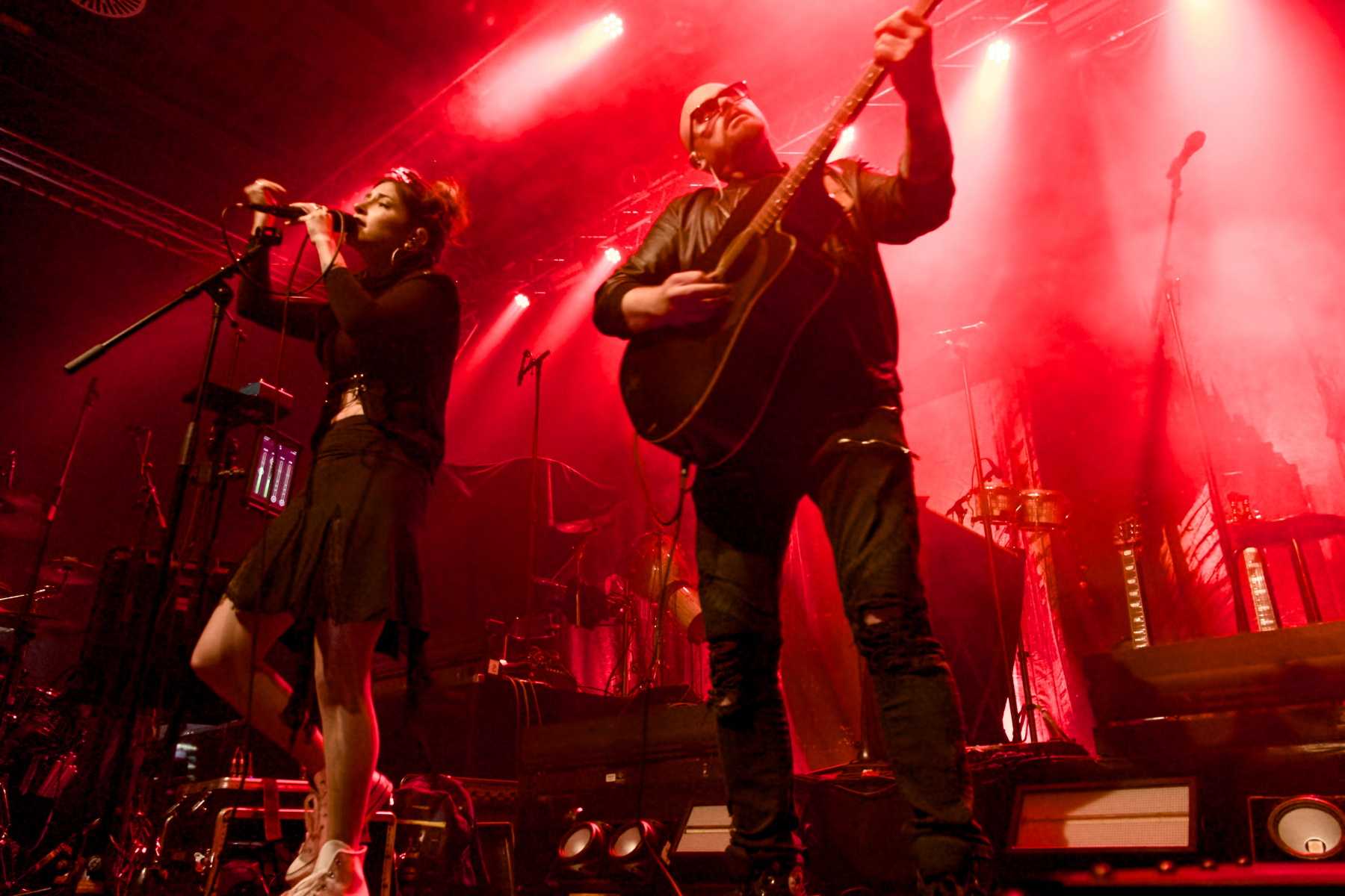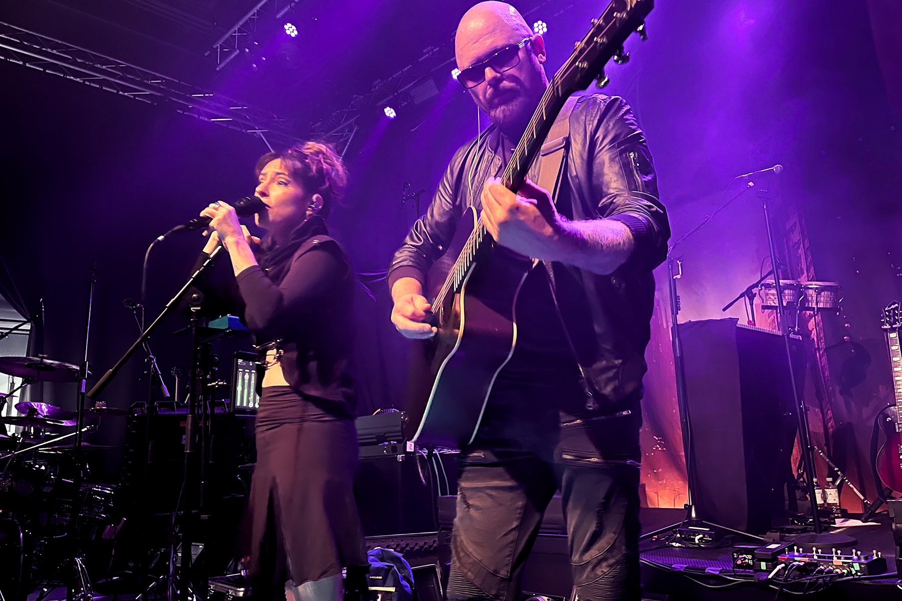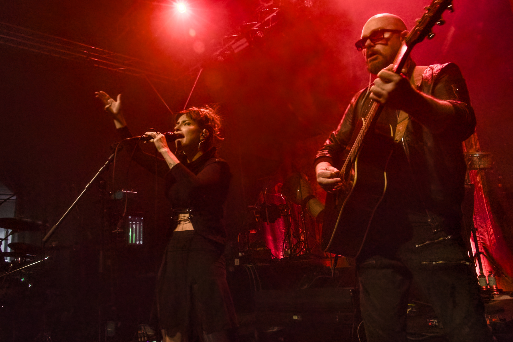 Zuerst waren Trope an der Reihe, auf die ich mich natürlich besonders gefreut habe. Ich würde mich als Fan der ersten Stunde in Deutschland bezeichnen: Kurz nach dem Release ihres überragenden Debüts „Eleutheromania“ (2021, Review hier) konnte ich mit Sängerin Diana Studenberg ein ausführliches Interview führen. Fortan haben mich die Kanadierin und ihr australischer Kompagnon Dave Thompson (a.k.a. Moonhead) immer mal wieder auf dem Laufenden gehalten, in welchen Teilen der Welt sie gerade unterwegs sind. Und das wurden in den vergangenen Jahren immer mehr: Ein erstes persönliches Treffen fand am 9. März 2022 in meiner Heimatstadt in oben erwähnter Turbinenhalle statt (als Support von „The Pineapple Thief“, Bildergalerie hier), und gerade erst haben die beiden sogar eine kurze US-Tour mit den legendären King’s X hinter sich.